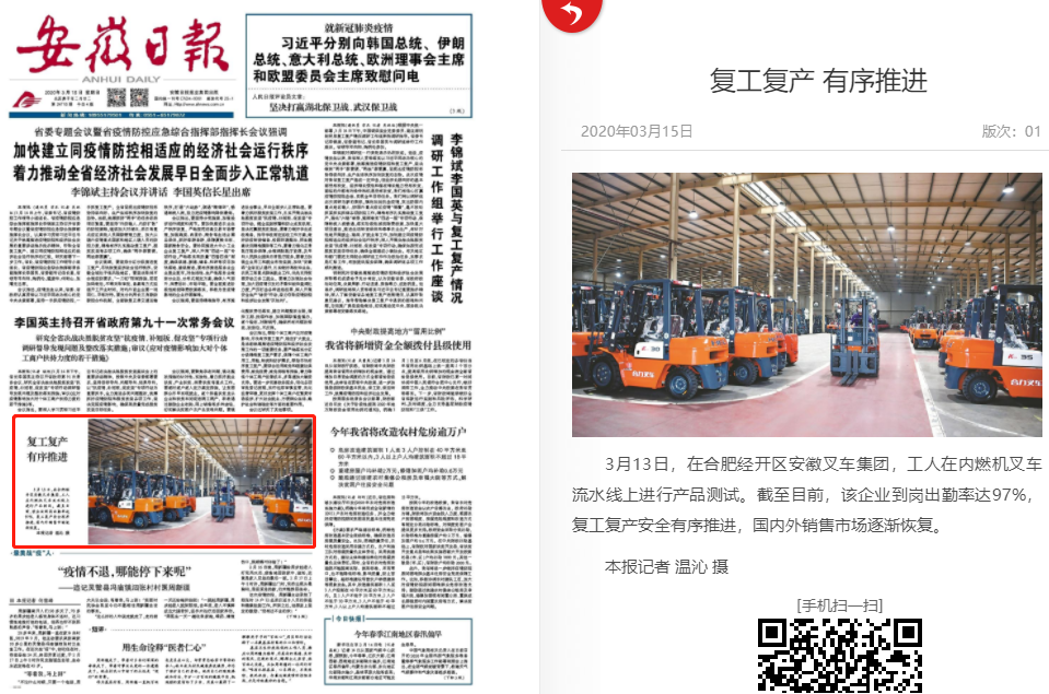 近日,《安徽日报》记者来公司采访复工复产情况,相关报道于3月15日在安徽日报头版上刊登。此外,近期股份公司2019年度报告公布,多家媒体转载报道“从百亿合力迈向百年合力”相关新闻,其中省国资委主动联系公司确认官方信息,并在其微信公众号上进行了头条推...