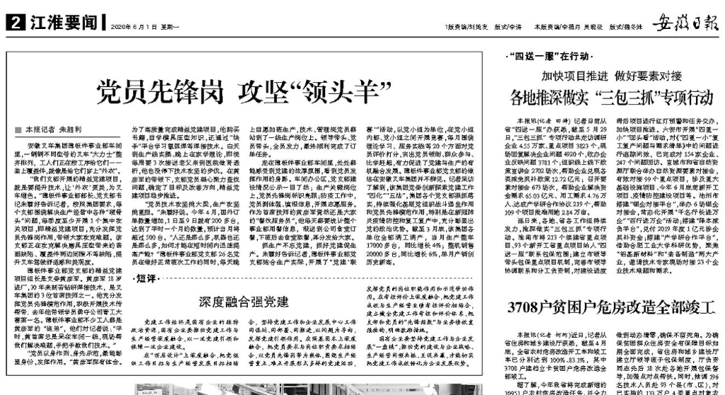 6月1日,《安徽日报》在“江淮要闻”版以“党建先锋岗 攻坚‘领头羊’”为题,报道安徽叉车集团薄板件事业部开展精益党建攻关,持续强化基层党组织战斗堡垒作用和党员先锋模范作用,将党建与生产经营深度融合的经验做法。 安徽日报02版报道截图 全文报...